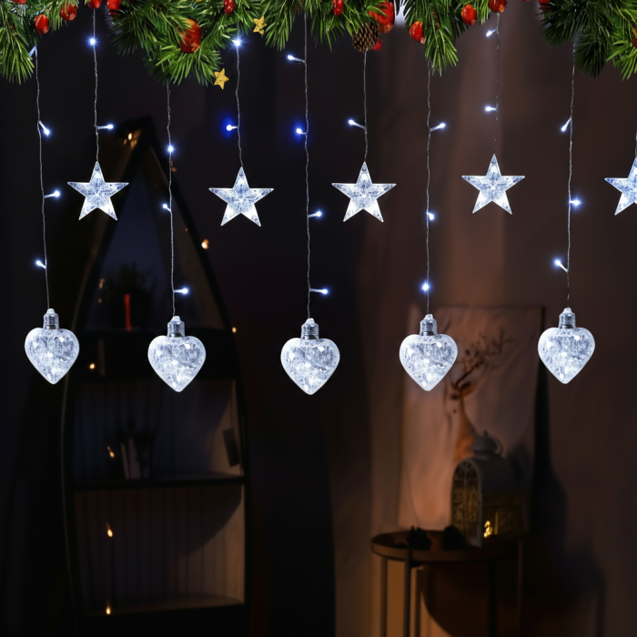 Creează o atmosferă romantică și festivă în același timp cu Instalația de Crăciun în formă de Inimă, 3x3 metri, culoare alb rece Ideală pentru decorarea ferestrelor, pereților, vitrinelor sau spațiilor comerciale, această perdea luminoasă oferă o lumină rece, intensă și uniformă, perfectă pentru sărbători sau evenimente speciale.