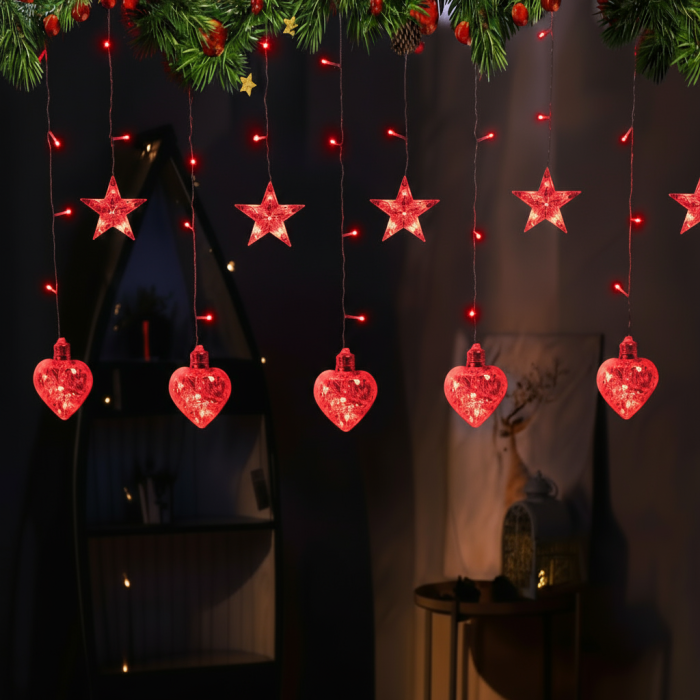 Creează o atmosferă romantică și festivă în același timp cu Instalația de Crăciun în formă de Inimă, 3x3 metri, culoare roșie. Ideală pentru decorarea ferestrelor, pereților, vitrinelor sau spațiilor comerciale, această perdea luminoasă oferă o lumină caldă, intensă și uniformă, perfectă pentru sărbători sau evenimente speciale.