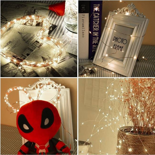 LED-urile Copper sunt montate pe un fir flexibil cu aspect metalic, ușor de modelat și adaptat oricărui tip de decor – brad, mobilier, cadre de ferestre, terase, oglinzi, ramuri, vitrine sau grădini.
