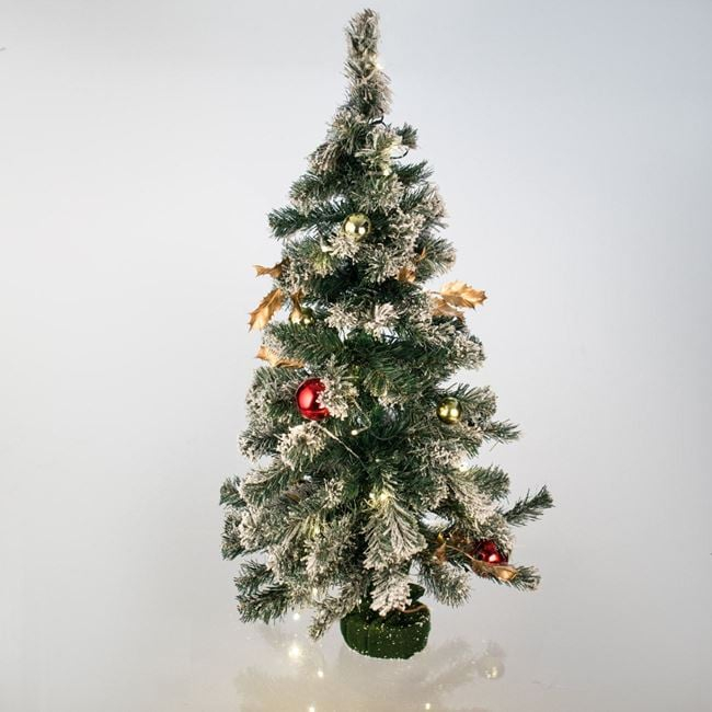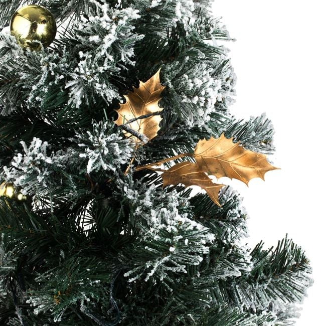 Bradul are ramuri bogate, înzăpezite, împodobite cu globuri, vâsc auriu și decorațiuni elegante, iar cele 40 de becuri LED cu lumină alb cald oferă o strălucire caldă și festivă.