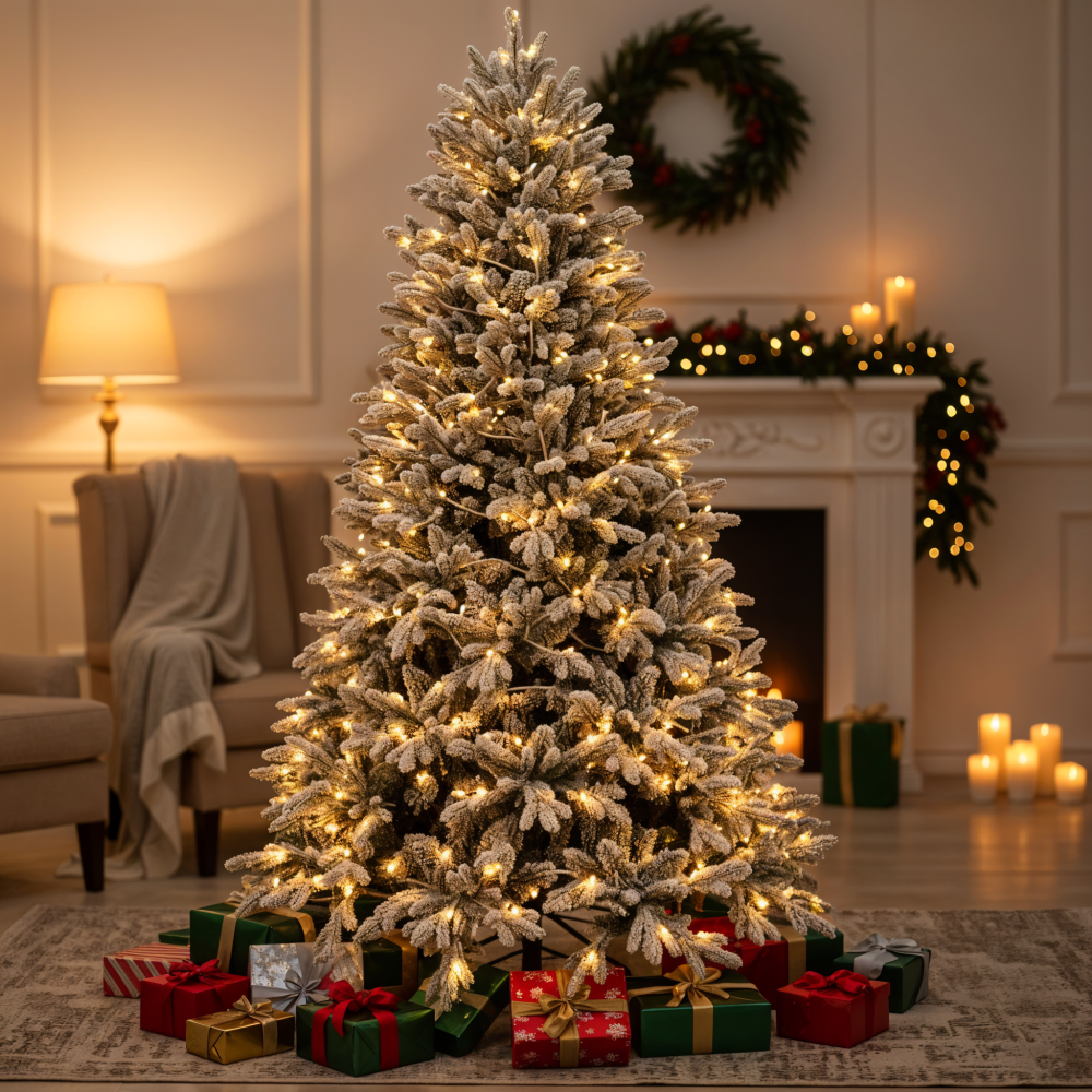 Acest brad de lux este alegerea perfectă pentru un decor elegant și rafinat. Ramurile bogate acoperite cu zăpadă artificială și conuri naturale oferă un aspect autentic, iar LED-urile alb cald adaugă o lumină blândă și plăcută.