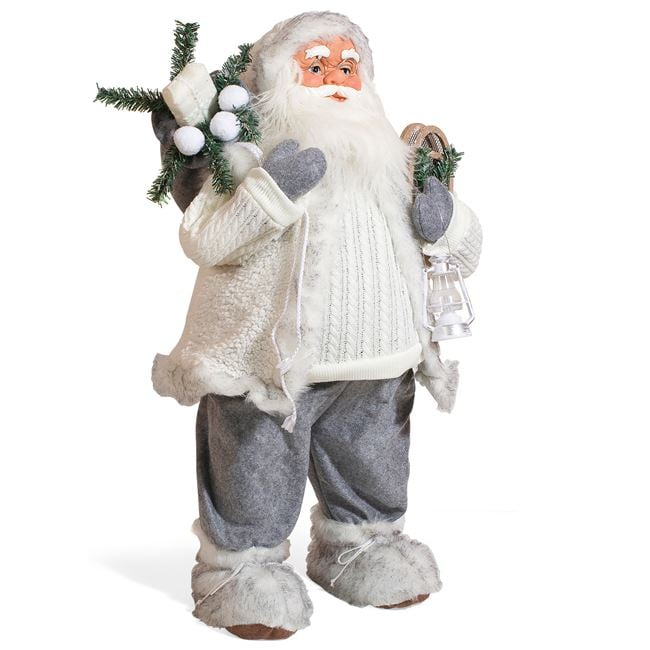 Adu un plus de rafinament și magie sărbătorilor cu această figurină decorativă Moș Crăciun alb cu felinar, având o înălțime generoasă de 80 cm, perfectă pentru decorurile elegante și luminoase de iarnă. Realizată în tonuri moderne de alb, gri și argintiu, figurina transmite puritate, calm și spiritul autentic al Crăciunului.