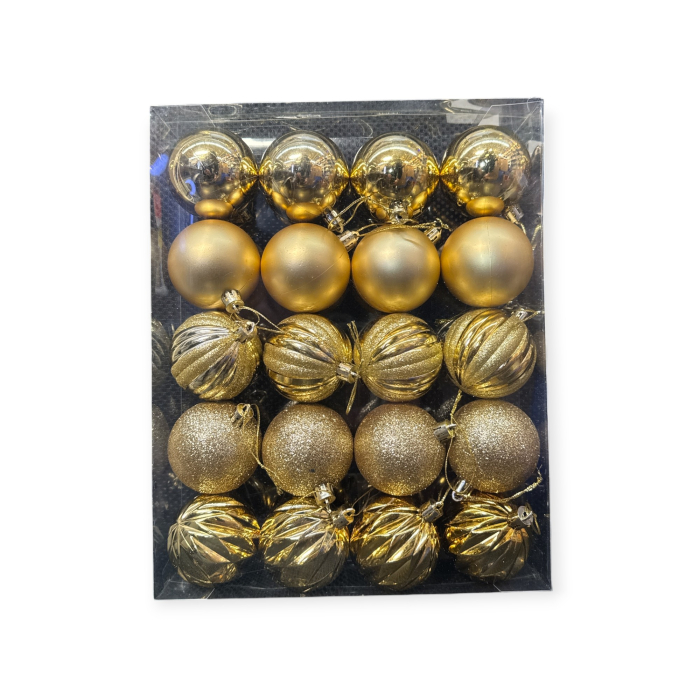Adaugă un plus de strălucire bradului tău cu setul de 20 de globulețe aurii, perfecte pentru un decor festiv elegant și luminos. Nuanța auriu metalic și finisajele variate transformă instant orice brad într-un punct central al sărbătorilor.