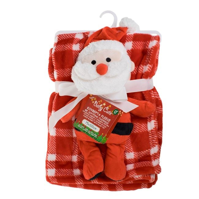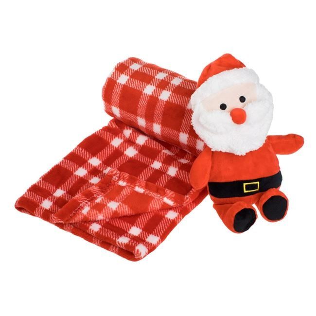 Patura Decorativa Catifelata de Craciun Rosie Velvet in Carouri cu Jucarie de Plus Mos Craciun 100x75cm