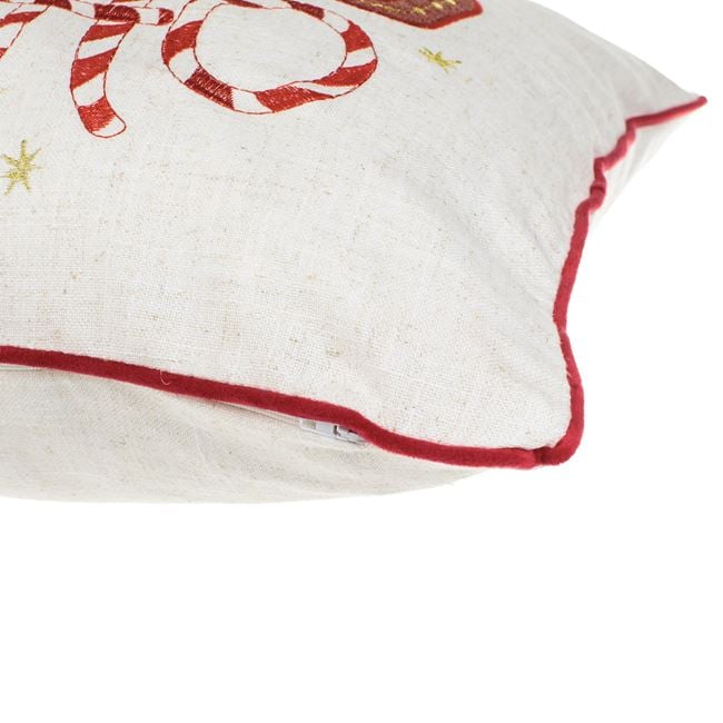 Adaugă un strop de magie sărbătorilor cu această față de pernă decorativă de Crăciun, în nuanță ecru, decorată cu o cizmuliță de Moș Crăciun, figurine de om de turtă dulce, acadea, cadouri și mesajul brodat „Ho Ho Ho”. Detaliile aurii din fir metalic și imprimeul cu stele oferă un aspect elegant și festiv.