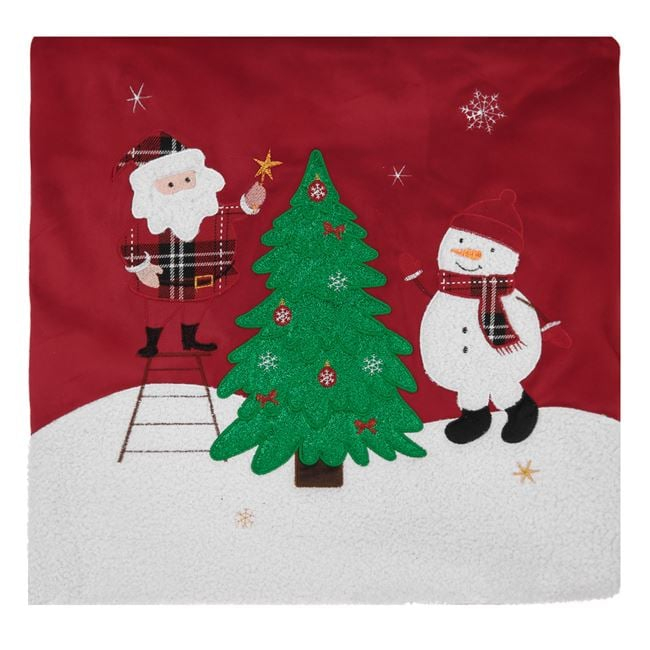 Adaugă magie sărbătorilor cu această față de pernă decorativă de Crăciun din catifea roșie, decorată cu Moș Crăciun, om de zăpadă și brad cu sclipici verde! 🌟 Perfectă pentru a transforma instant orice cameră într-un spațiu cald, festiv și plin de farmec. ❤️